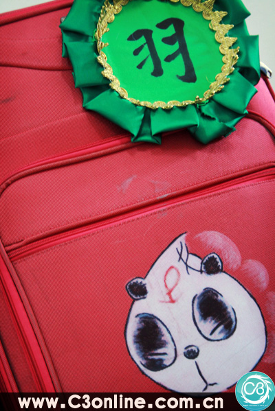 桃子的旅行箱(内含了大量服装道具)手绘的熊猫和关羽徽章相当有个人风格。