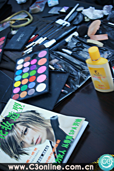琳琅满目的化妆道具。其实只是很小的一部分,事实上两张化妆桌都已经被化妆品占据了。