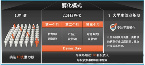 欢迎高校大学生游戏创业团队报名加入“大学生移动游戏创业基地”前来了解“孵化器招募计划”。
