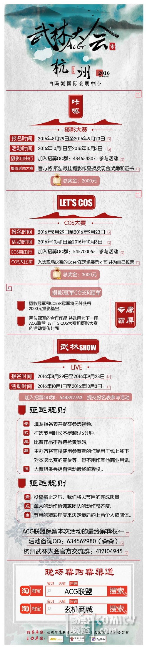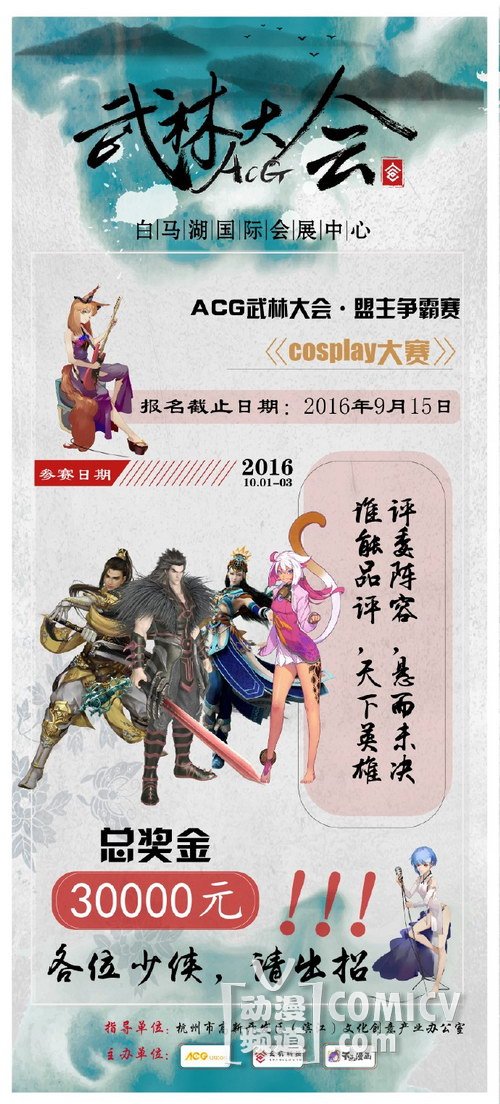 ACG武林大会·盟主争霸赛暨COSPLAY大赛现正在火热报名中,报名截止日期9月15日,总奖金高达30000万!各位少侠,请出招!