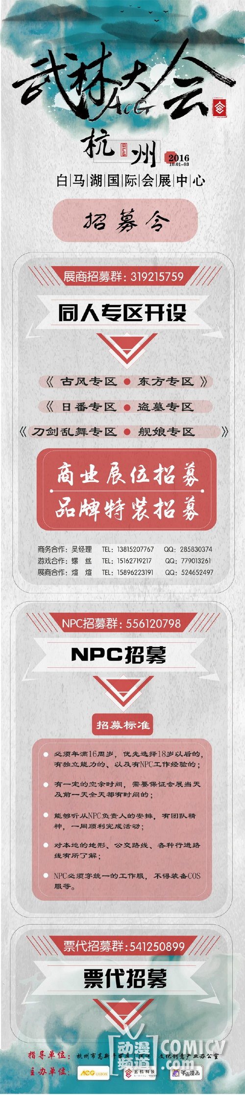 武林大会开设各类专区,先面向古风、东方、日番、盗墓、刀剑乱舞、舰娘等专区招募,具体联系人: