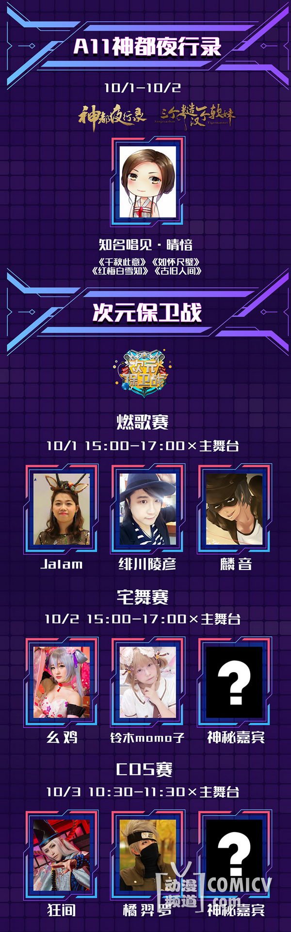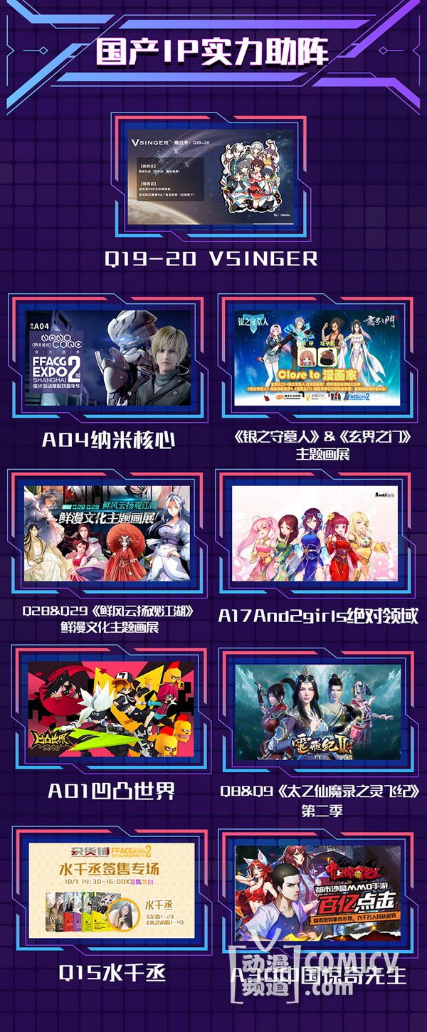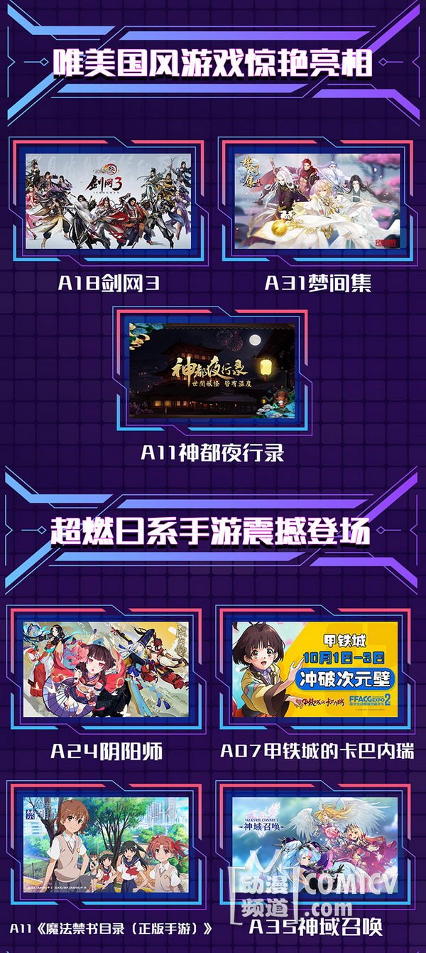 天闻角川,海岸线工作室-《纳米核心》,艾漫,Hobbymax,七创社-《凹凸世界》,Vsinger ,网易游戏-《魔法禁书目录(正版手游)》、阴阳师、神都夜行录、非人学园,盛大游戏-《神无月》、《神域召唤》,腾讯游戏-《初音未来:梦幻歌姬》,西山居-剑网3重制版、梦间集等诸多实力动漫游戏厂商加盟!