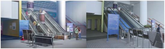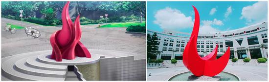 图中学校正门的这一个电梯,通向校园最核心的主干道,若不是有人物在,小编简直分不清这两张图哪张是实景,哪张是动画了。