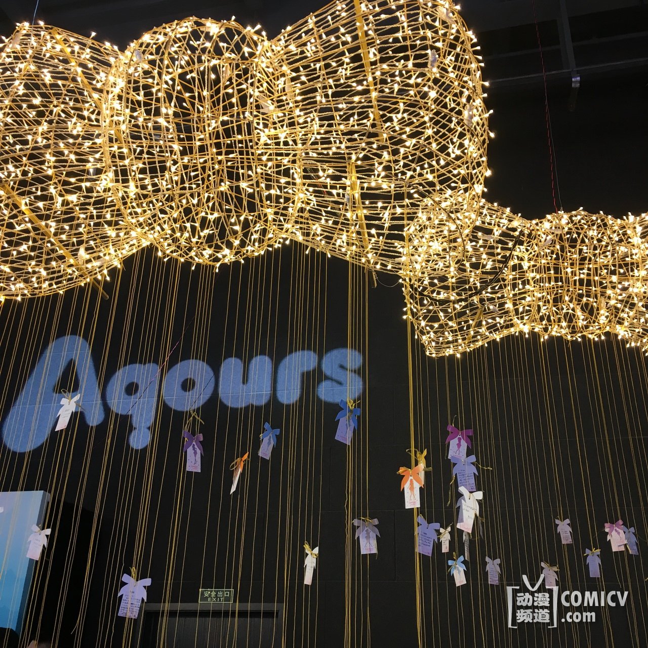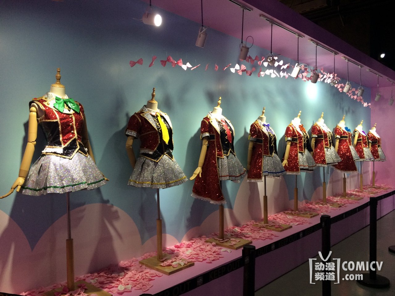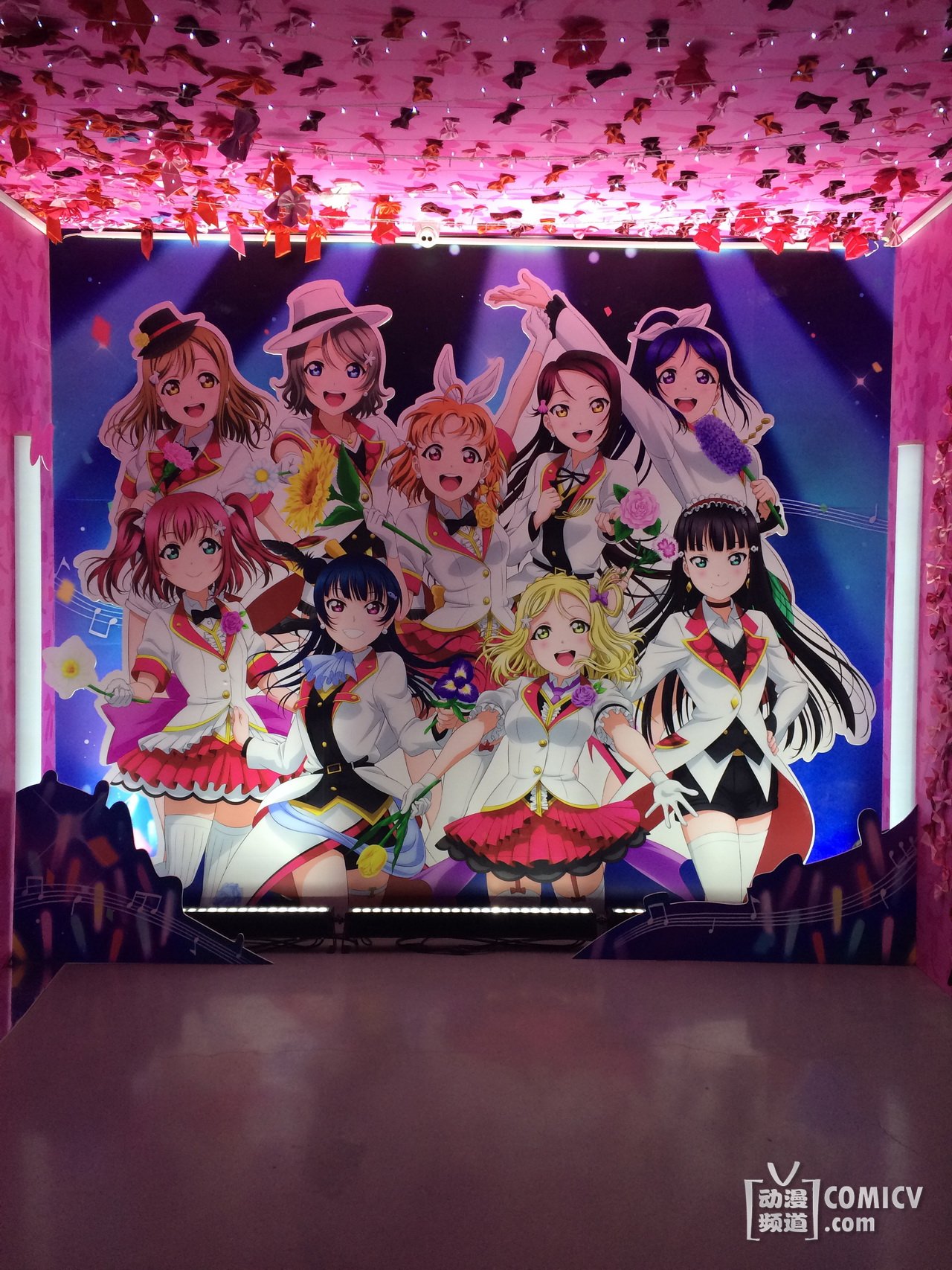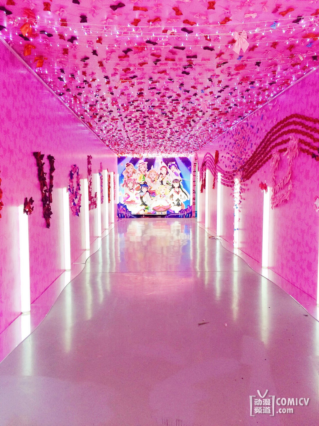 企划展现场的入口是本次“Love Live! Sunshine!! Showtime”的LOGO大门,入口长达20米左右的隧道是由无数的蝴蝶结所组成的“L o v e L i v e”字样,另外一边的五线谱飞扬的蝴蝶结像一个个脚印,正缓缓走向走廊尽头的舞台!