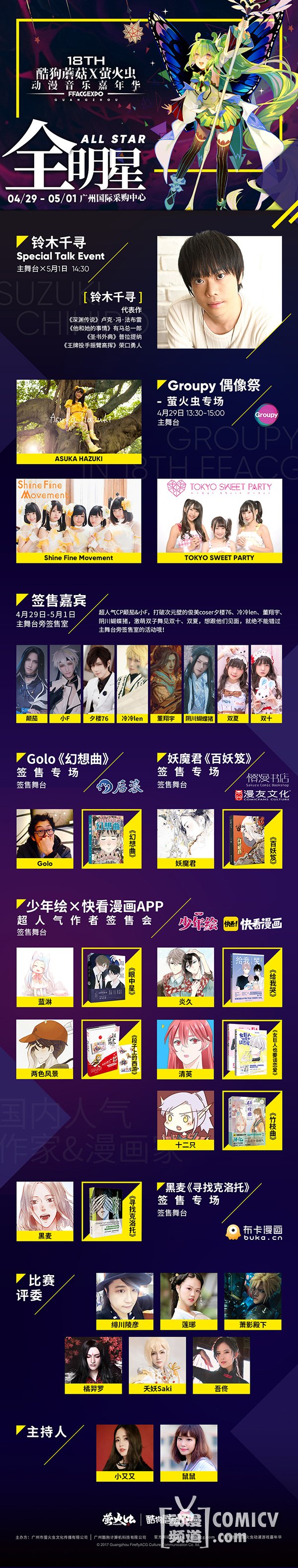 本届萤火虫漫展不仅请来了亚洲知名声优铃木千寻,还有人气coser / 漫画家 / 唱见 / 舞见 / 主持等众多二次元红星齐聚!悄悄告诉你,还有更多神秘嘉宾情报未公布哦,小伙伴们敬请期待吧~